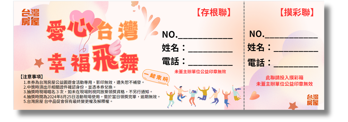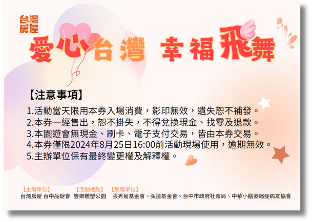 主辦單位:台灣房屋台中品促會 受贈單位:台中市政府社會局、張秀菊基金會、弘道基金會、中華小腦萎縮症病友協會