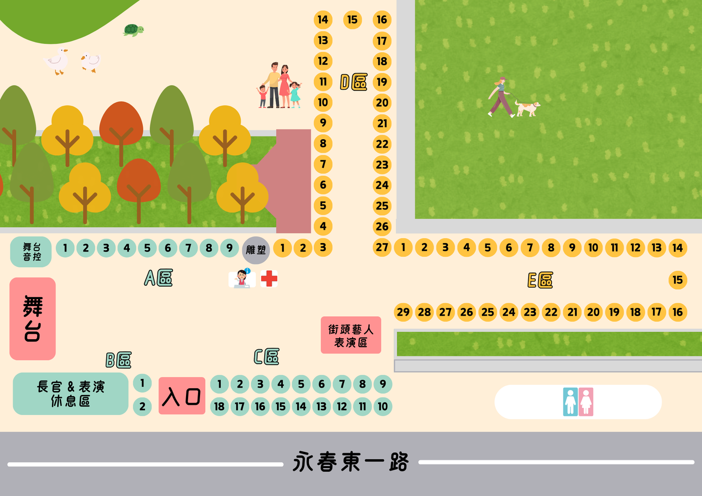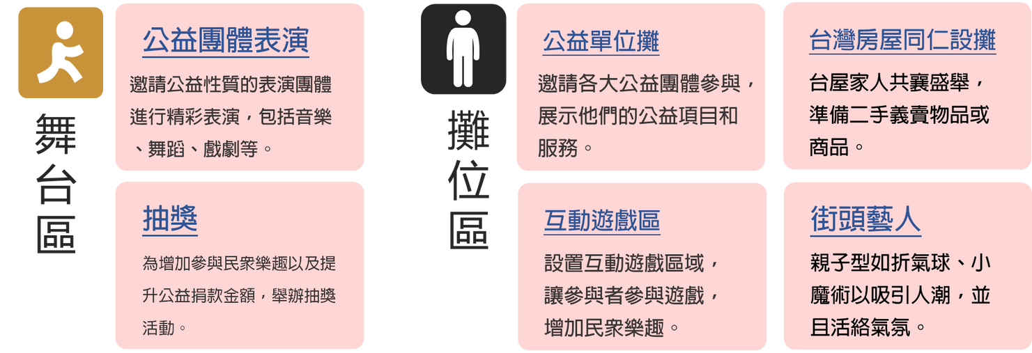 園遊會結合了各種不同類型的活動,如公益商品攤位、多種類型攤位、表演節目、街頭藝人等,滿足不同年齡層和興趣的參與者需求。